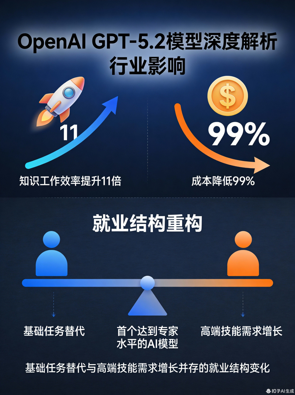 潜在挑战方面,就业结构将面临显著变化。一方面,基础任务存在替代风险,GPT-5.2 在 GDPval 任务中展现的高效低成本特性可能导致部分重复性知识工作岗位需求减少;另一方面,高端技能需求将同步增长,如与 AI 协作、复杂问题定义等能力的重要性日益凸显。