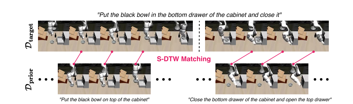 举个具体的例子:当目标任务是“将碗放入橱柜抽屉并关闭”时,现有全轨迹检索方法可能因为找不到“完全一致的完整轨迹”而束手无策,却忽略了“拾取碗”“推动抽屉关闭”这些核心子动作,在“将杯子放在抽屉上”“打开顶柜并关闭底柜”等其他任务中其实普遍存在。