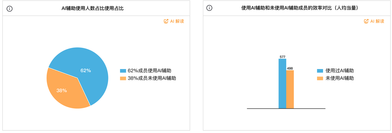 覆盖度指标: 旨在还原 AI 的真实渗透情况。通过“AI 普及率”观测研发环节的应用广度,利用“代码接受率”评估应用深度。两者结合,能够客观验证 AI 工具在编码环节是否真正“落地生根”。