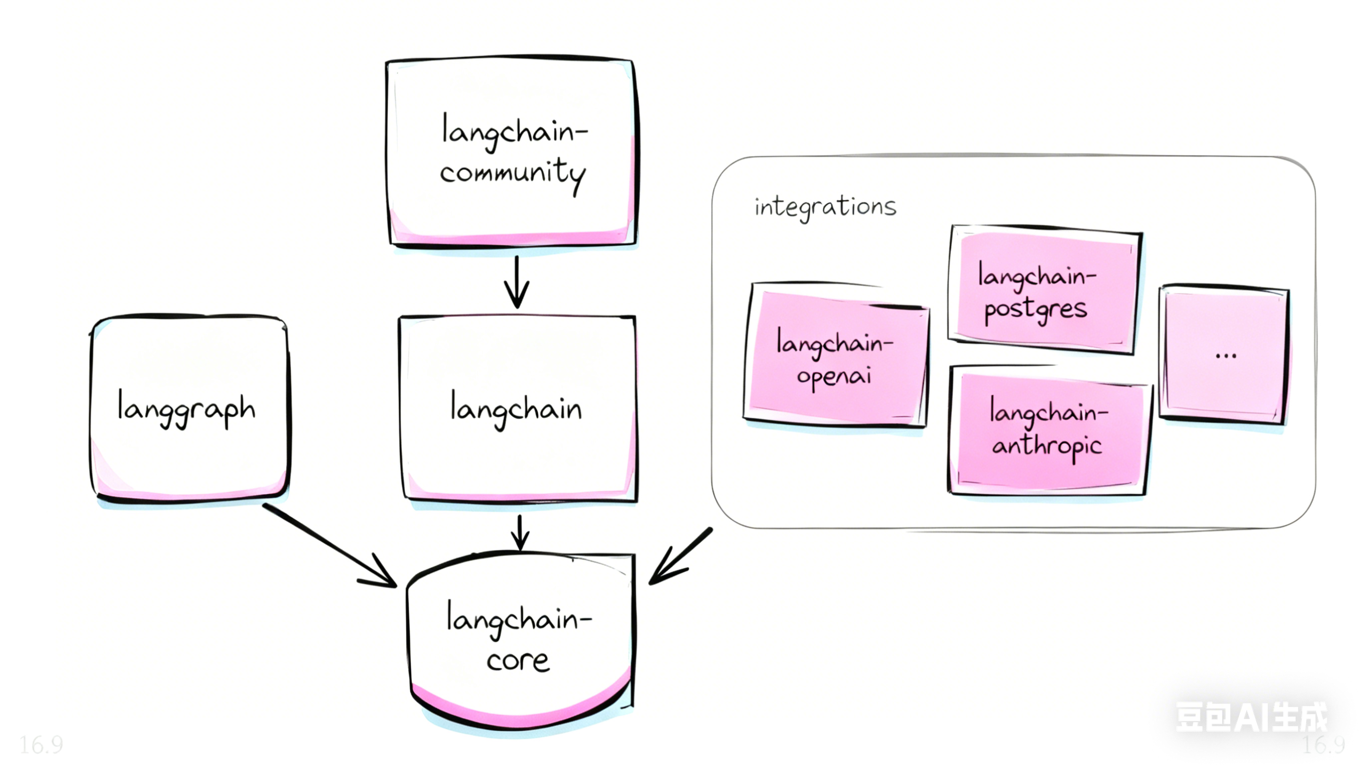 langchain逐渐轻量化,将第三方集成拆分到独立子库中,减少冗余依赖。- 子库的更新迭代更灵活,兼容性更好。因此,