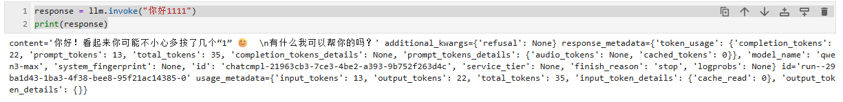 可以看到,AI 给出了他的回答;我们这里就使用的是 langchain 第一个核心方法invoke