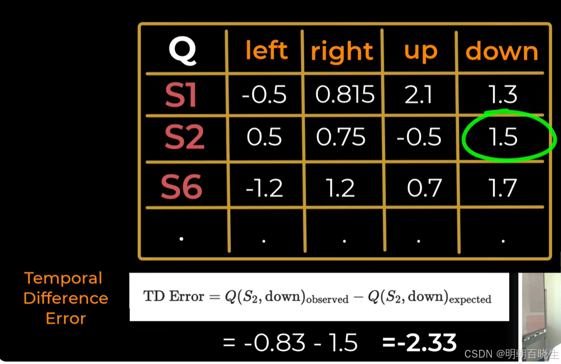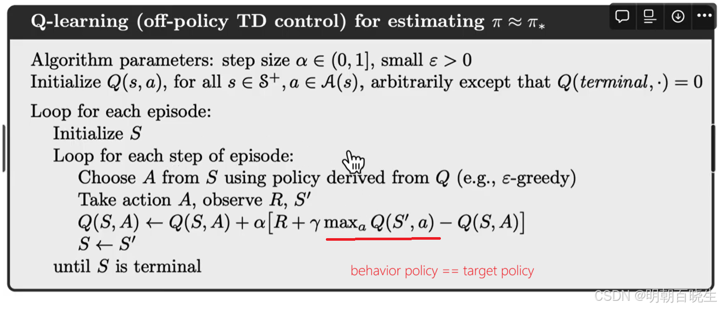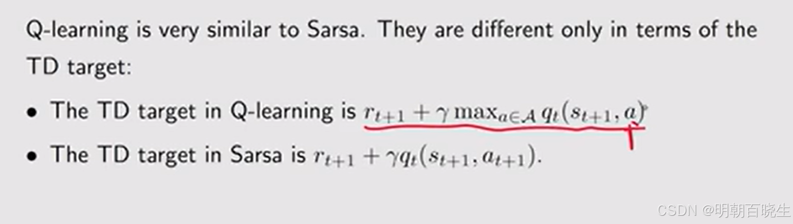 Q-learning 的表达式与 Sarsa 相似,二者仅在时序差分(TD)target上有所不同: