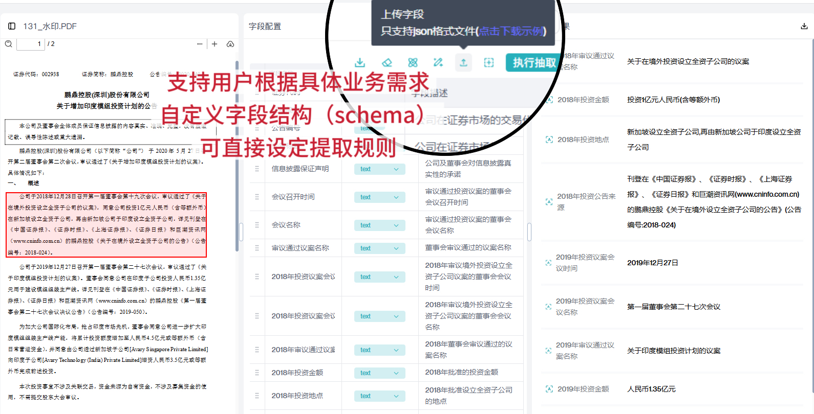 支持用户根据具体业务需求,自定义字段结构(schema),例如合同中的 “甲方名称”“合同金额”“有效期”“违约责任” 等核心要素,可直接设定提取规则,实现定向精准抽取,适配企业标准化业务流程。