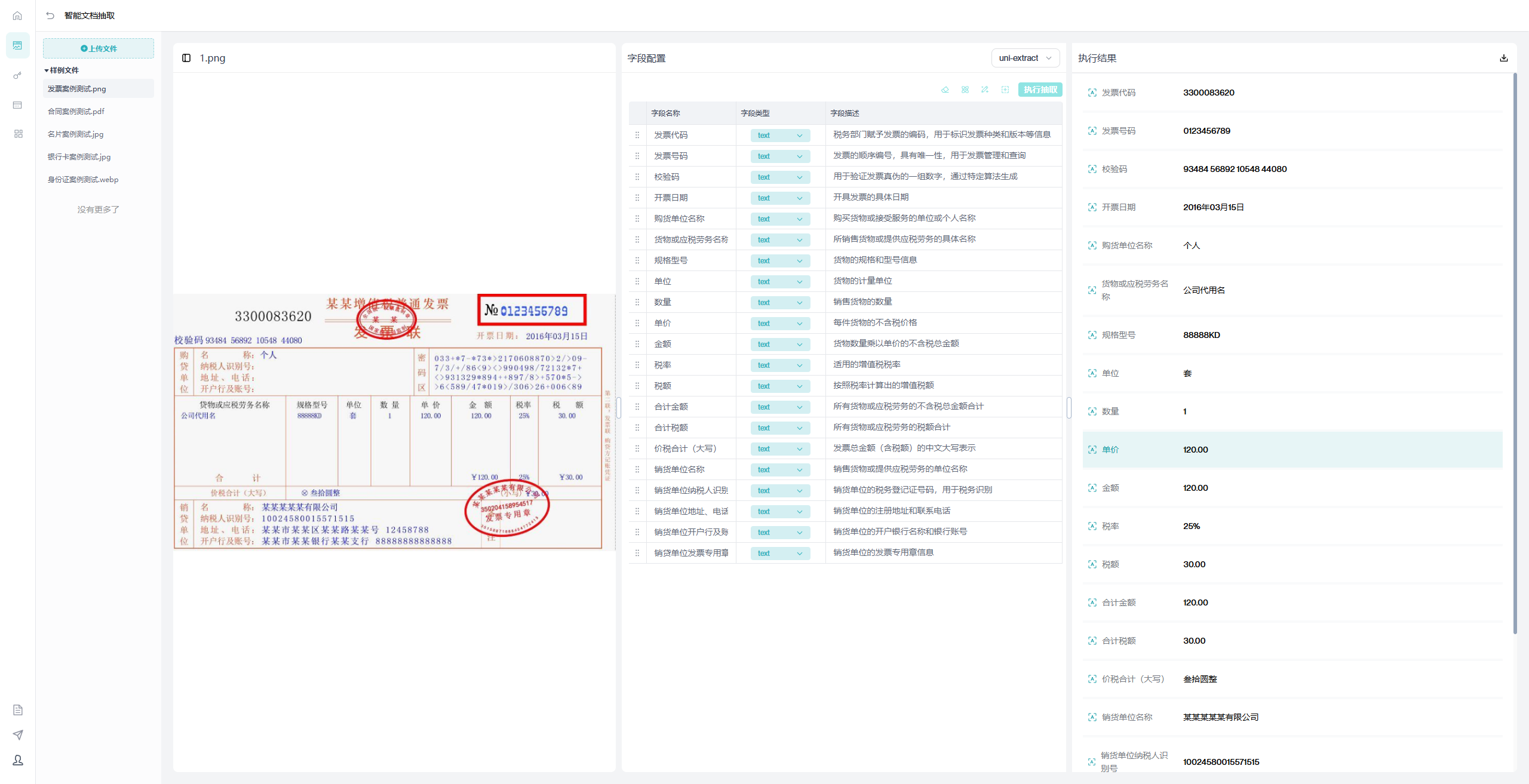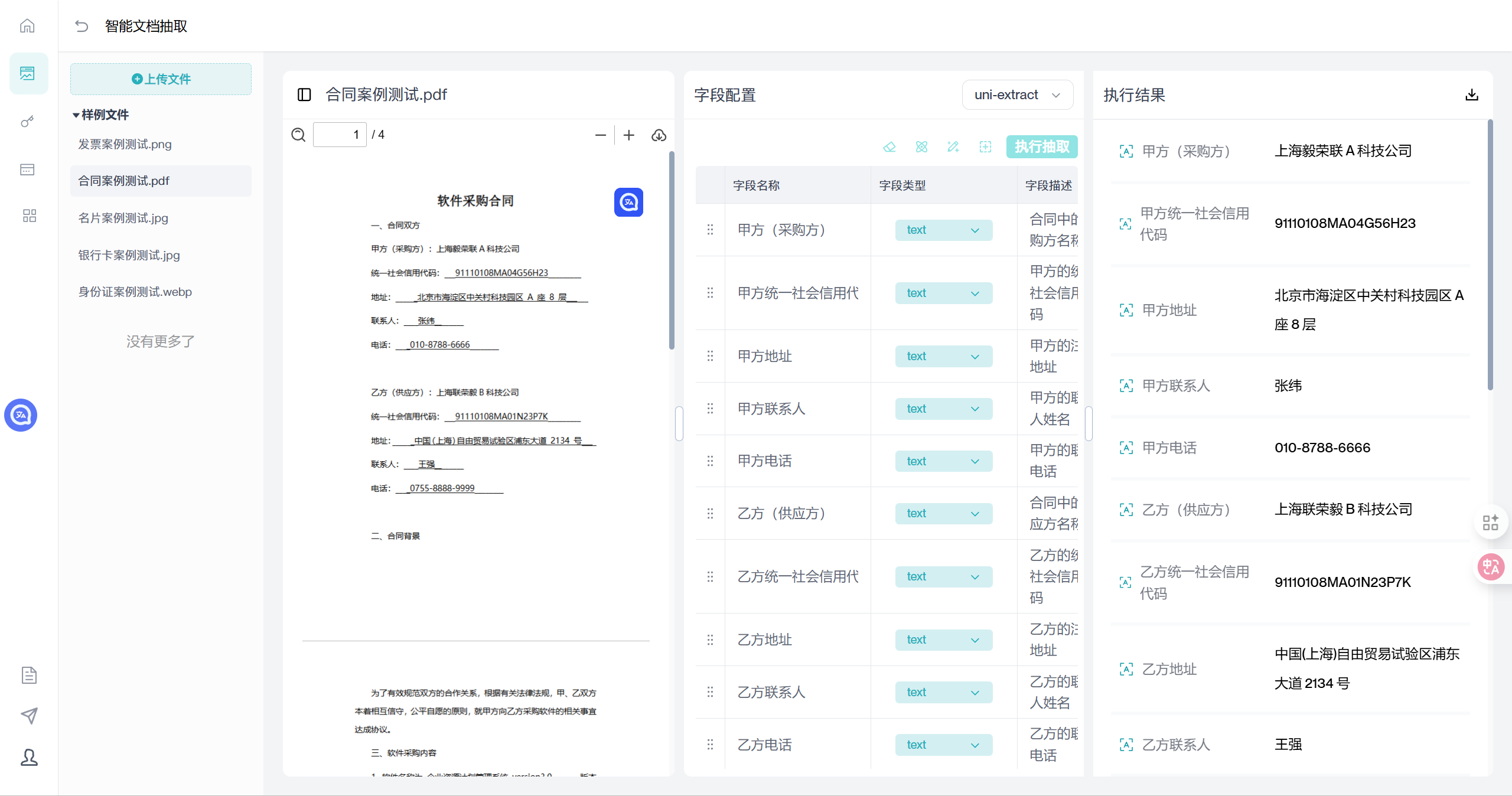 - 执照抽取:营业执照信息一键提取,企业注册、资质审核无需手动填写;