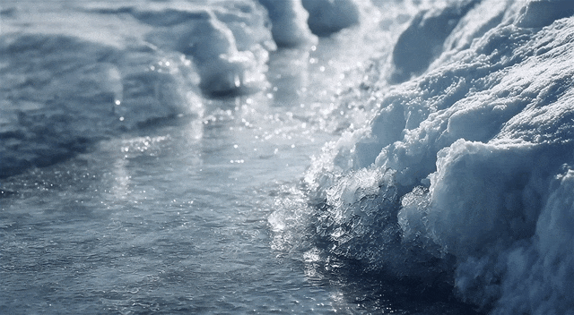 Prompt:固定镜头记录冰雪融化的场景。冰层边缘持续融化,水珠从冰块顶部断续滴落,落入下方水流中,激起微小水花。水流在冰层间缓慢流动,水面泛起轻微涟漪。冰层内部出现细微裂痕,伴随脆响。滴水声与冰裂声交替出现,背景为寂静清冷的清晨环境音,包括远处微弱的风声与自然空旷感的回响。