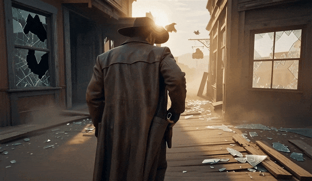 一位风尘仆仆粗犷牛仔,从腰侧枪套中拿出一把枪,指节紧绷,目光横扫西部鬼城的荒凉街道,呢喃着,「这地界活人可待不住」。