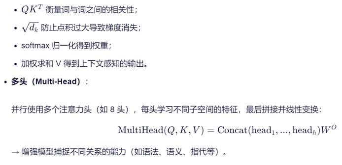 通过 自注意力机制 动态计算每个词在上下文中的重要性权重,从而构建全局语义表示,无需递归、无需卷积,实现高效、强大的序列建模。