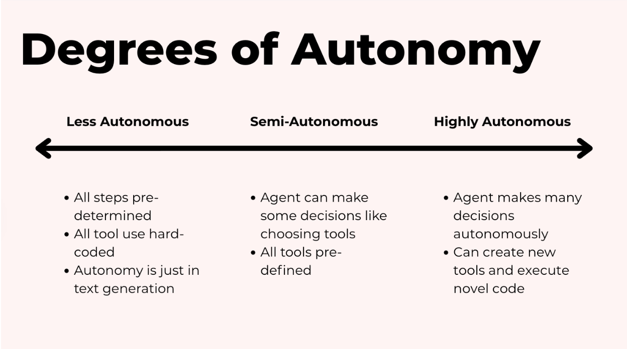 实际上,大多数现实世界中的智能体处于中间状态,属于半自主智能体。智能体从你定义的工具中进行选择,并在你设定的规则范围内做出决策。