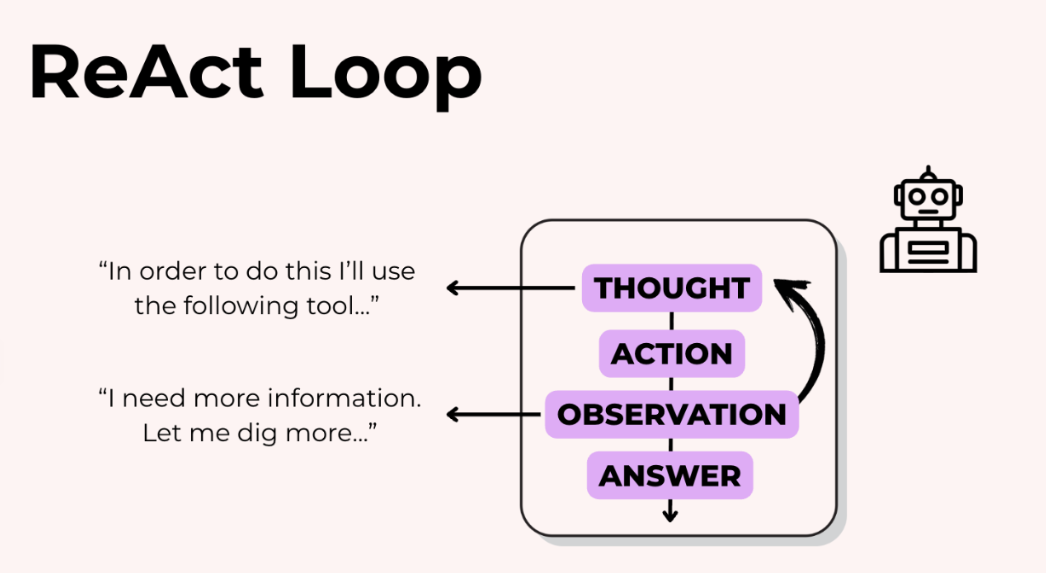 这就是人们所说的ReAct循环。模型会思考下一步该做什么,然后采取行动(通常是调用一个工具,我们稍后会详细讨论),观察结果,然后要么给你一个答案,要么循环回去再次思考。