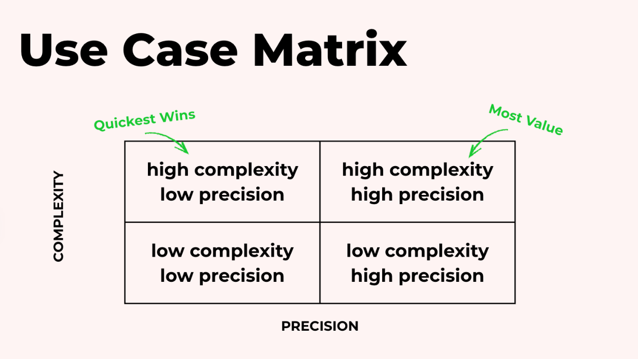 最大的价值往往来自高复杂度的工作,而最快的早期成果往往出现在低精度的方面。这就是为什么高复杂度、低精度的象限通常是明智的起点。你可以通过自动化处理棘手的事情获得助力,而不会每次都因需要完美的输出而受阻。