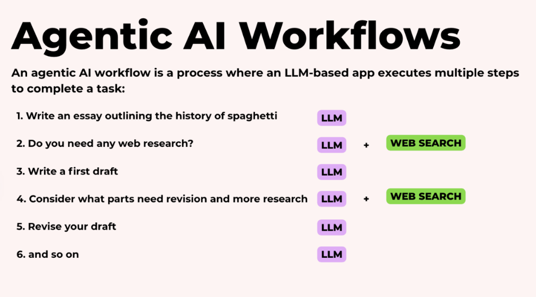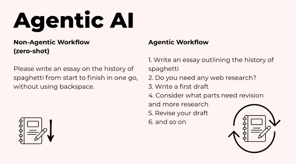 好的,让我们从基础开始:究竟什么是AI 智能体?这是最简单的思考方式。想象一下,你需要写一篇文章。如果你使用传统的大语言模型(LLM)提示,你基本上会说:“嘿,ChatGPT,给我写一篇关于如何开始健身的文章”,然后它就会从头到尾一次性写完整个内容。但这可不是你我实际写文章的方式,对吧?我们不会一下子就写出完美的初稿。我们会先规划、列提纲、做些研究,写出一份杂乱的初稿,然后反复阅读并修改。这是一个