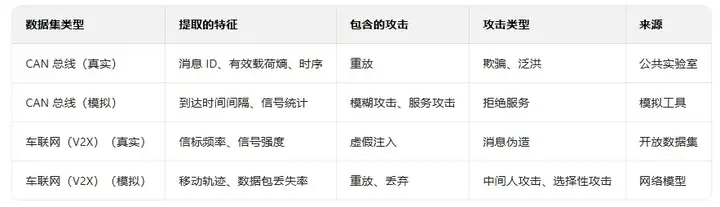 此外,还纳入了捕捉车对车(V2V)和车对基础设施(V2I)通信的车联网(V2X)数据集。这些数据集模拟了动态移动场景,包括在对抗性操纵下的协同感知消息和安全信标。通过到达时间间隔、有效载荷熵和与基准标准的统计偏差等特征提取方法对流量轨迹进行预处理。