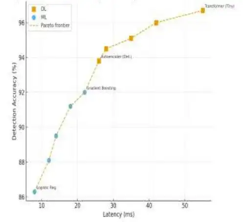 相比之下,最近文献中报道的仅深度学习入侵检测系统框架取得了较高的准确率,但在延迟开销方面面临挑战,在嵌入式环境中经常超过每数据包 10 毫秒。相比之下,本研究采用的混合卷积神经网络 - 长短期记忆(CNN-LSTM)设计表现出卓越的平衡,准确率保持在 95% 以上,同时延迟控制在 5 毫秒以下,如图 2 所示。这使得混合模型既有效又在操作上可行。