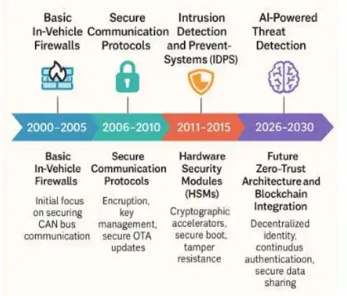 图 1、汽车嵌入式系统网络安全解决方案的演进时间线