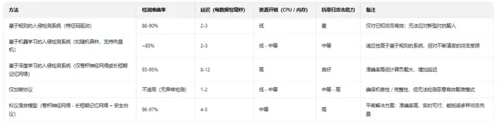 表 2、拟议混合模型与传统入侵检测系统 / 协议的基准比较