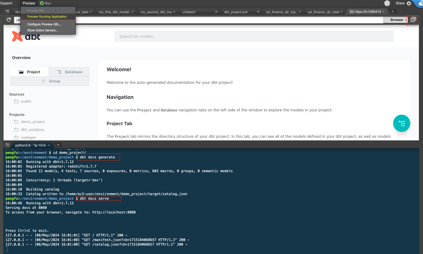 接下来,我们需要安装 dbt(Data Build Tool),在 Cloud9 环境中,运行以下命令来安装 dbt Core 和 dbt Redshift 适配器: