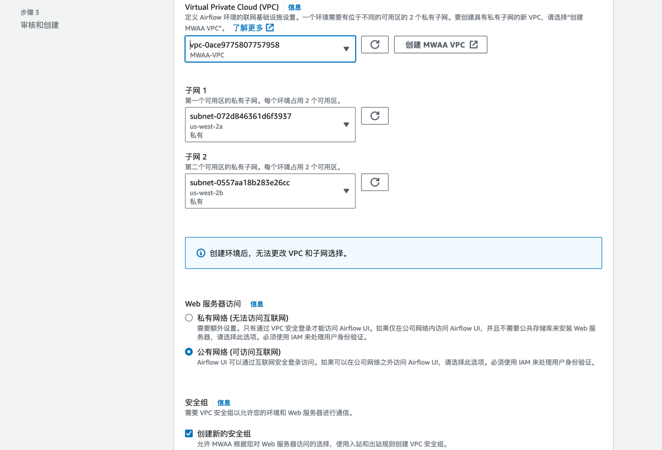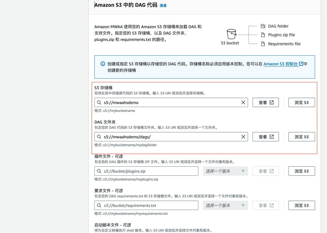 接下来,我们需要搭建 MWAA(Managed Workflows for Apache Airflow)环境,用于管理和调度数据处理任务。在开始之前,需要先创建 S3 桶和 dags 文件夹,并填入到 MWAA 环境信息中。