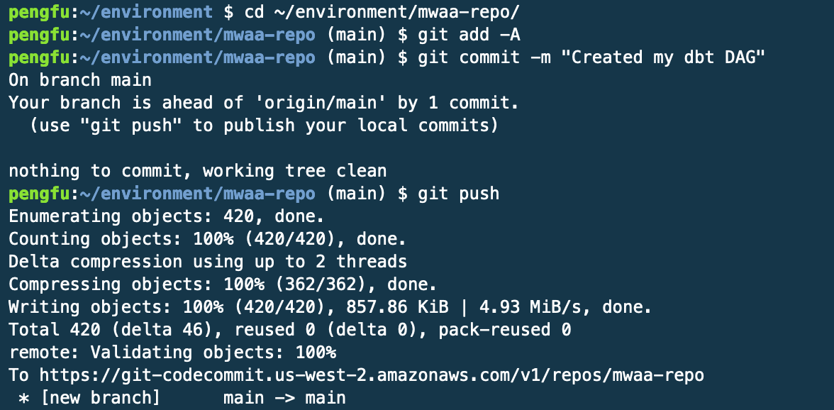 首先,需要将整个dbt项目和Airflow DAG文件(如dbt_dags.py)复制到MWAA环境关联的S3桶中的dags文件夹下。然后,将这些文件推送到Amazon CodeCommit存储库,之前配置的CodePipeline将自动触发,并将更新后的文件同步到MWAA的S3桶。