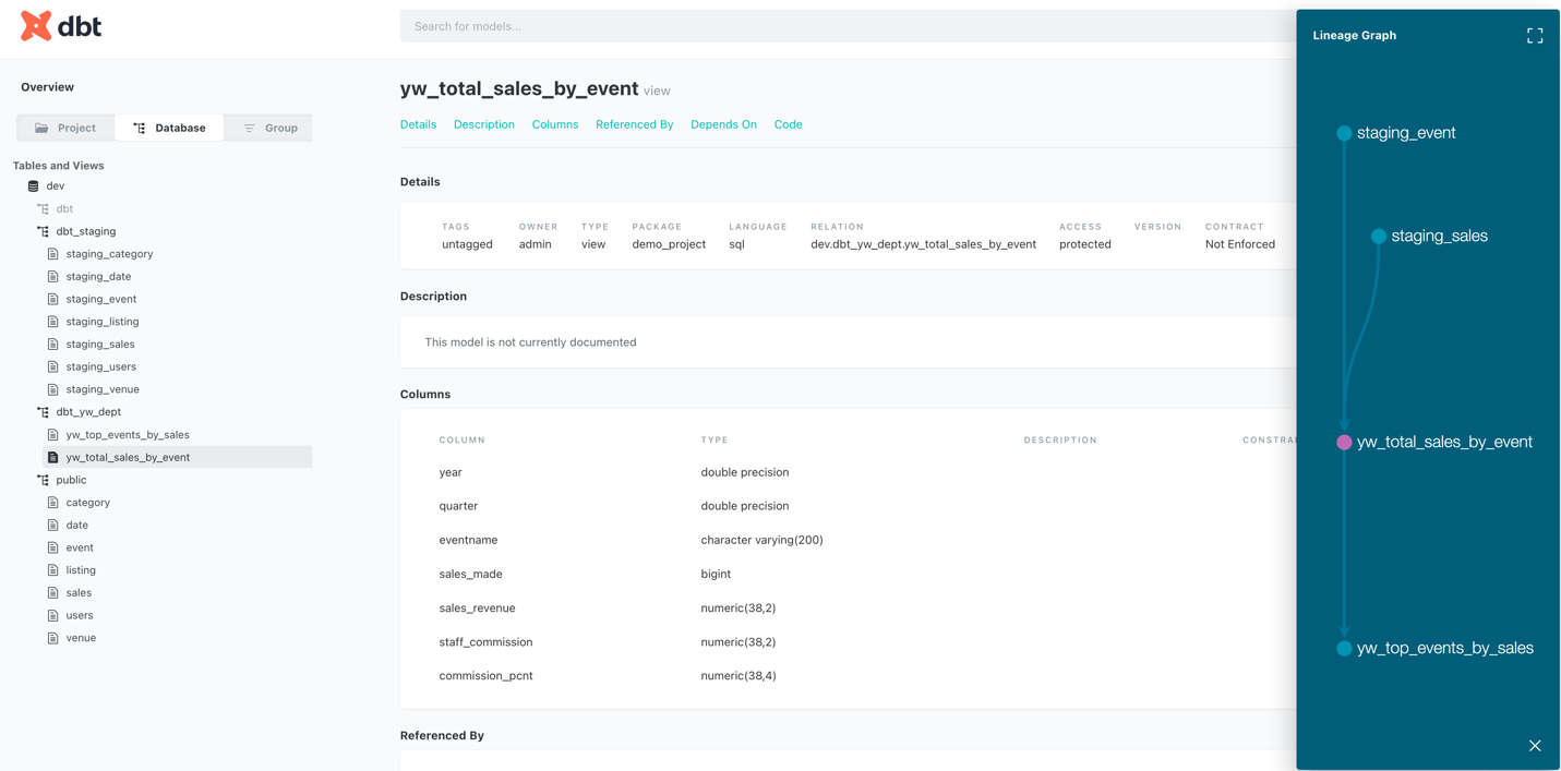 dbt不仅能够进行数据转换,还提供了强大的文档生成功能,包括数据血缘图,通过执行dbt docs generate命令生成文档,并使用dbt docs serve启动本地Web服务,即可查看详细的模型信息。