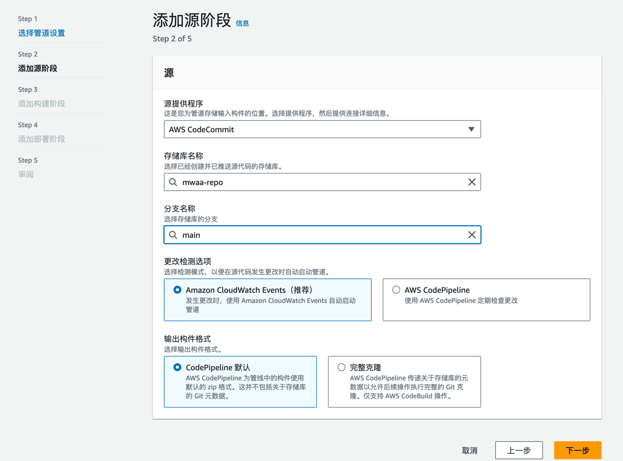 为了实现代码的自动化部署,我们需要构建一个 CI/CD 管道。创建 codecommit 存储仓库,以 mwaa-repo 为例。创建 codepipeline,构建管道,首先添加源。以 codecommit 为源,选择存储库与分支。