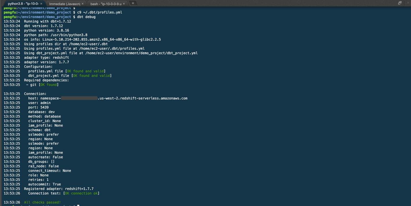 编辑完成后,运行以下命令测试 dbt 是否能够成功连接到 Redshift: