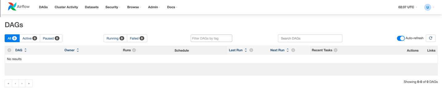 此过程需要 20-30 分钟,待创建完毕后,进入 airflow UI。此时因为 S3 桶中 dags 目录下为空,所以没有任何 DAG。