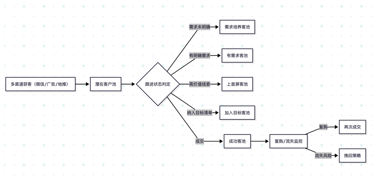优秀的CRM需实现“获客-跟进-转化-复购-留存”的全链路闭环,核心目标是: