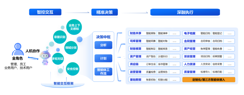 系统互操作类:本质为业务意图理解、流程自动化等多智能体的协作,通过自然语言指令精准解析业务逻辑,实现制单、审批、提交等系统任务的自动化操作。
