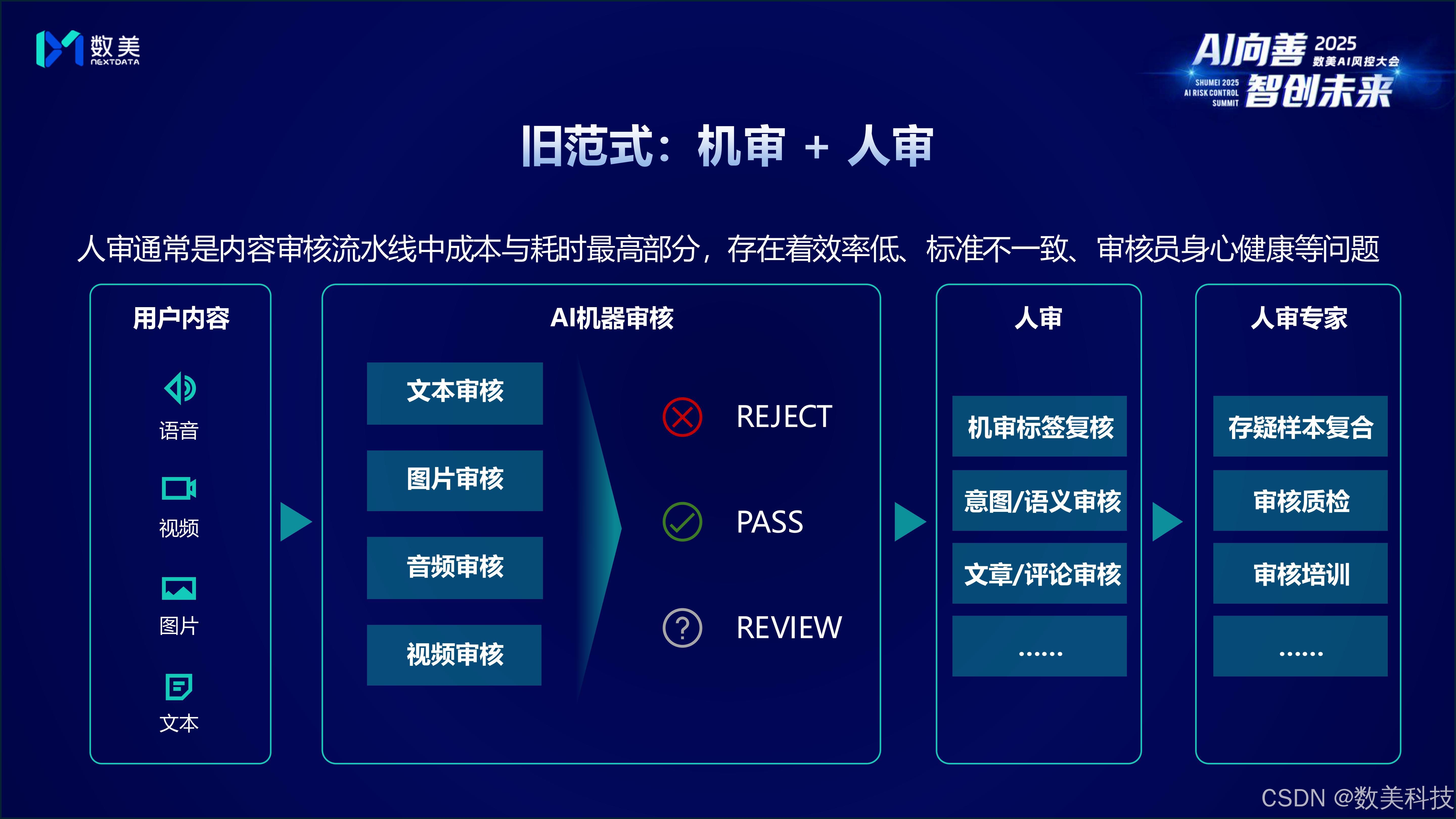 AI 时代的风控,不是用机器完全取代人,而是重构人与机器的关系。数美提出的新范式,将传统的“机审+人审”升级为“AI 机器审核 + 大模型审核 Agent + 专家决策”的三角链路。