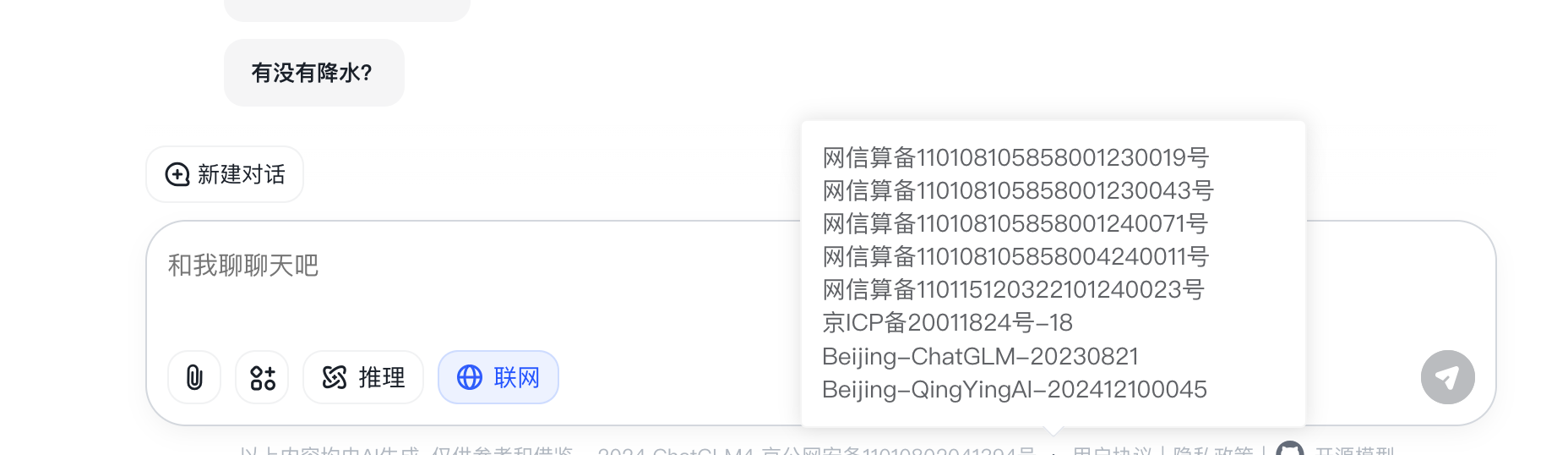 以智谱清言为例,网站底部悬挂备案号及公示链接,APP、小程序等在”关于我们“”隐私中心“等位置悬挂。