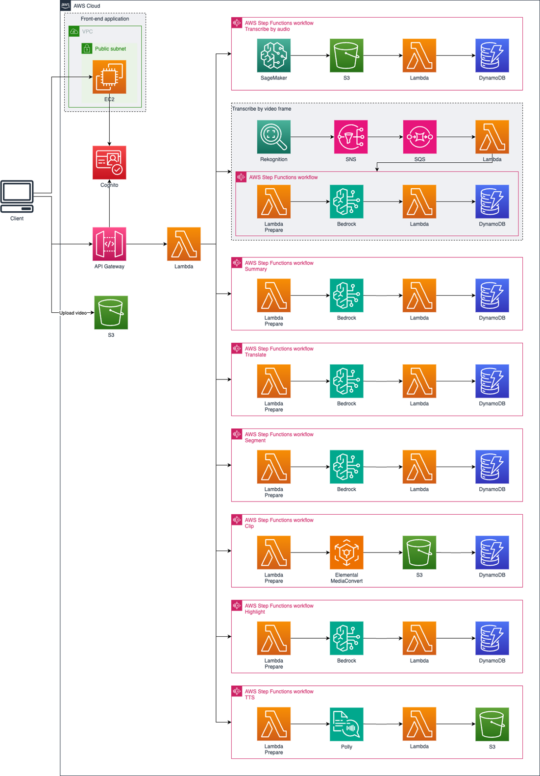 - workflow 协调层:通过 Step Functions 协调各模块工作流,实现 “上传 - 理解 - 抽取 - 合成 - 输出” 全流程自动化推进,支持异常重试、流程监控与日志追溯;