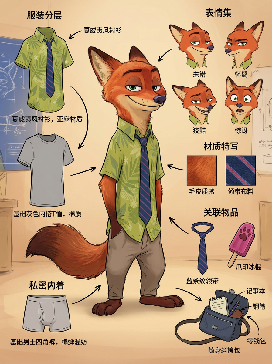 六、执行逻辑:深入分析主体核心特征、穿着风格与潜在性格特点。提取可拆解的一级元素(如外套、鞋子、大幅表情等),发挥想象构思设计二级深度元素(如内衣风格、包里口红色号等)。生成组合图,确保透视准确、光影和谐、注释清晰。