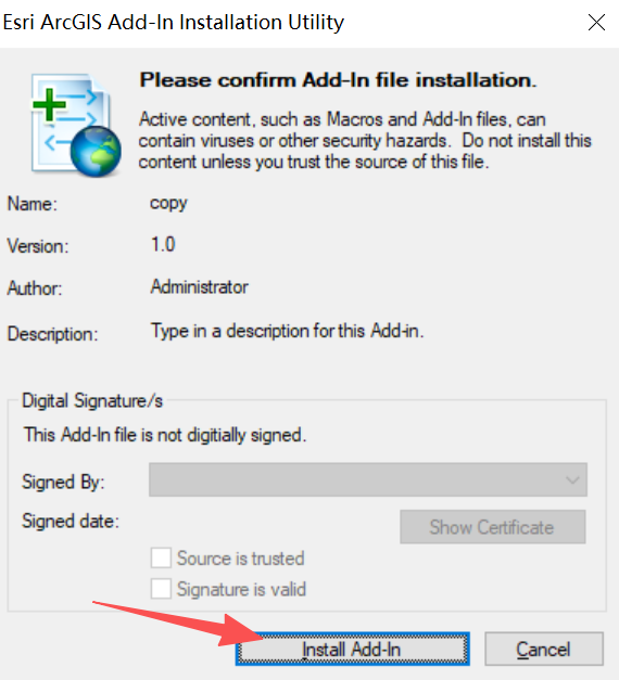 - 双击打开copy.esriAddIn文件,点击install add-in安装