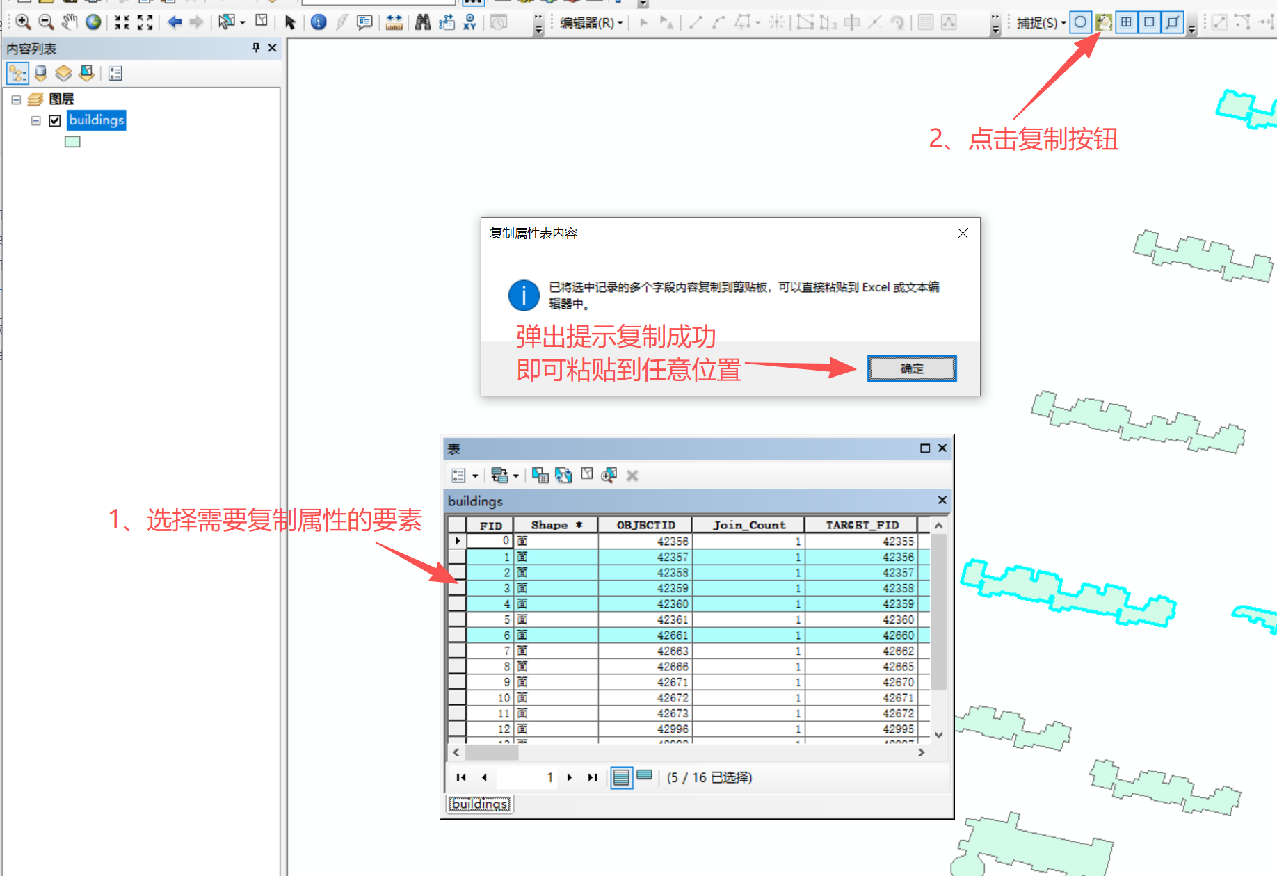 ArcMap 属性表“一键复制”工具:在 ArcMap 中,选中要素图层及其属性表记录后,点击按钮即可将多字段、多行记录按 Excel 兼容格式复制到剪贴板,直接粘贴到 Excel、Word、记事本等任意软件中。