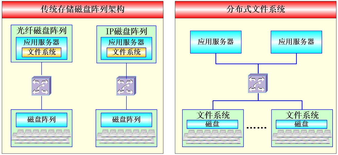 这两种存储架构并没有绝对的优劣之分。一方面,磁盘阵列(RAID)以可靠性高、稳定性好,功能丰富而著称,并在以往应用实践中得到了广泛认可,通过RAID可以保证应用服务器不受单块磁盘损坏而丢失数据或中断业务。但与此同时,传统存储阵列也暴露出了横向扩展性差、价格昂贵、弹性缺乏、数据连通困难等不足,容易形成数据孤岛。
