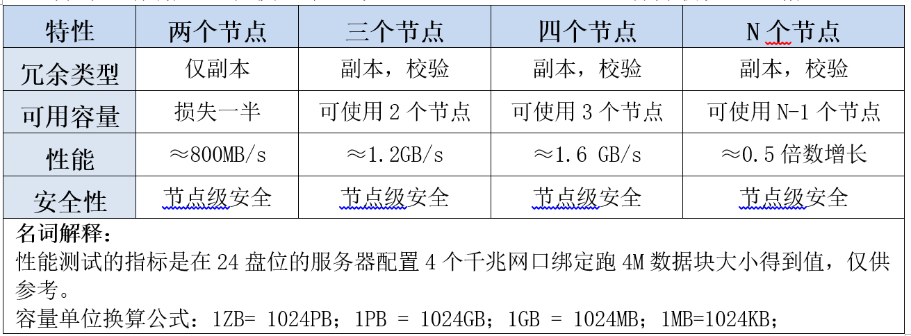分布式存储系统从使用节点数,空间,性能,安全进行分析如下表格:
