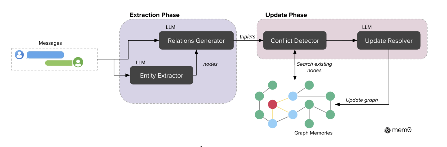 - 信息提取:LLM 从对话中自动提取出相关记忆,识别重要实体及其关系。