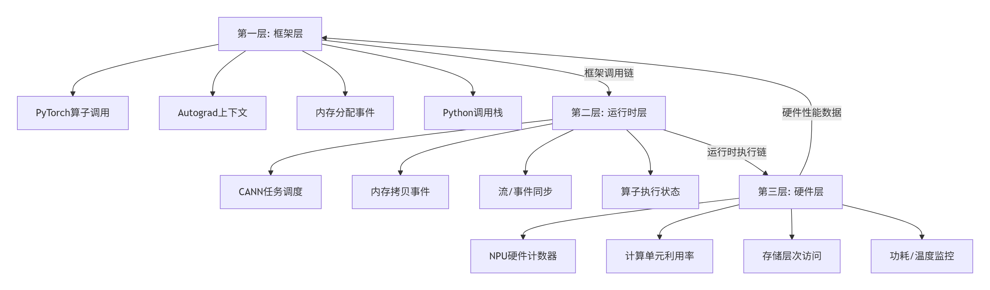 torch_npu.profiler采用三层数据采集架构,不同层级的性能数据形成互补关系,这是理解其强大能力的关键: