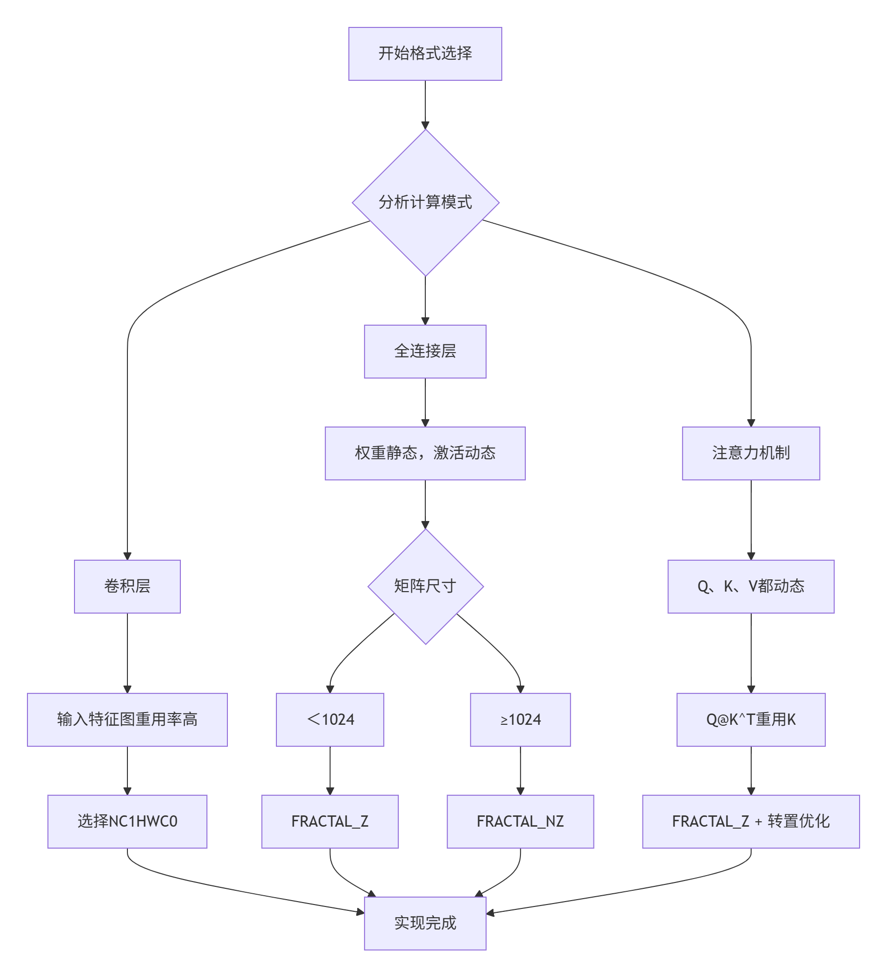 实战经验:在GPT-3的FFN层优化中,我通过将FRACTAL_Z改为FRACTAL_NZ,将计算利用率从72%提升至89%。关键原因是FFN层的两个输入矩阵都来自动态激活,没有明显的重用模式。
