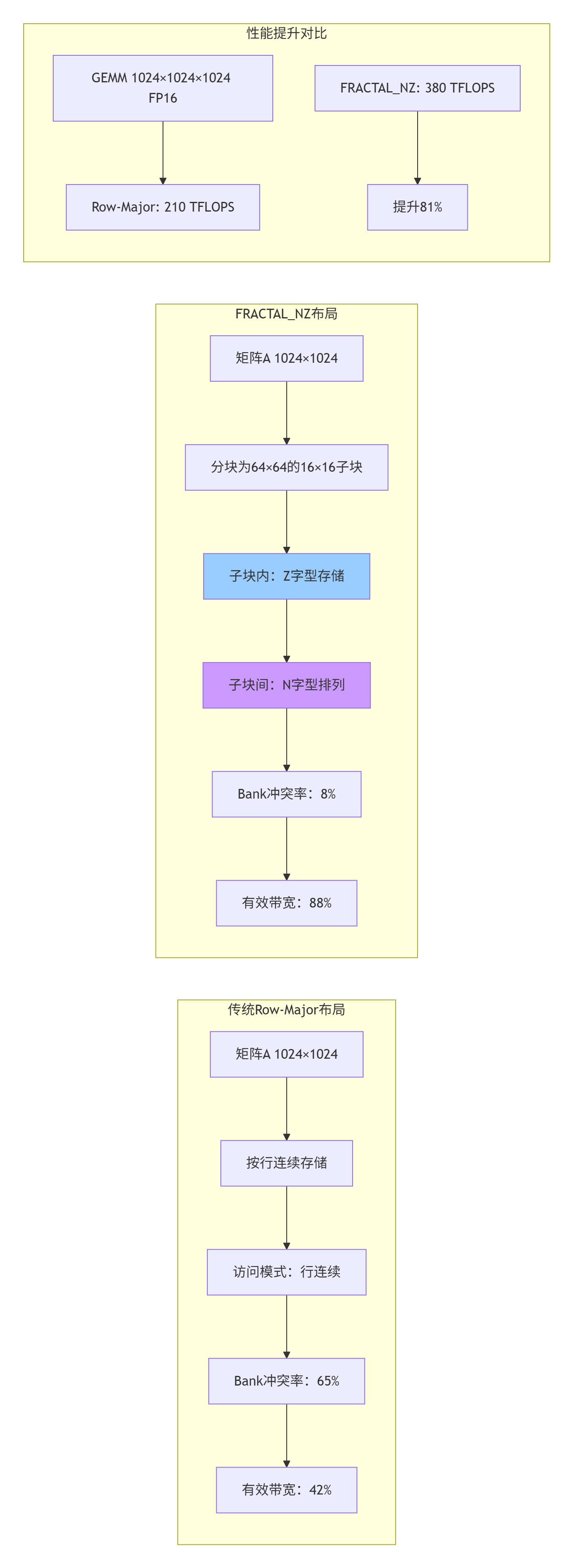 如果说NC1HWC0是针对卷积的优化,那么FRACTAL_NZ就是为矩阵乘法(GEMM)而生的极致格式。2019年,我在优化BERT-large的注意力机制时发现,传统的行优先(Row-Major)布局在Cube单元上产生了严重的Bank冲突,导致计算利用率仅40%。