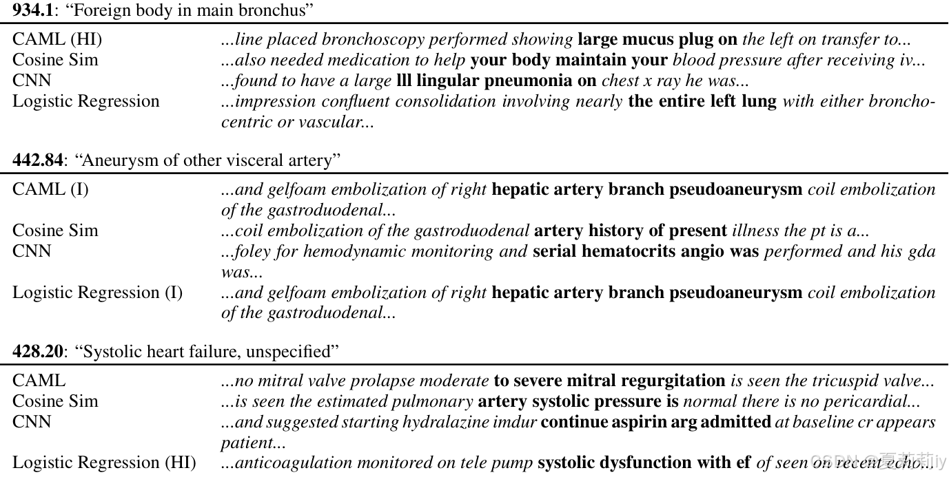 ①I表示相关,HI表示高相关,CAML总是能抓住比较相关的文本: