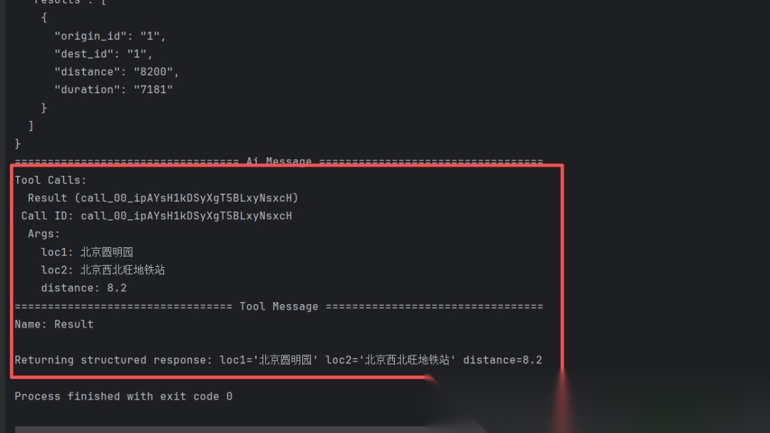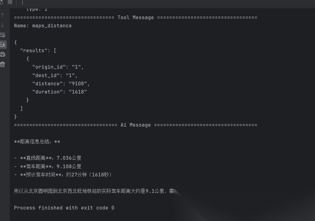 在[《LangChain 1.0 速通指南(一)——LangChain 1.0 核心升级》])中曾提到,create_agent API 的一个重要特性是支持结构化输出。这一功能极大地方便了后续的数据处理与系统集成。本节将基于前面高德地图 MCP 的示例,演示如何让智能体返回标准化的距离信息,格式如下:
