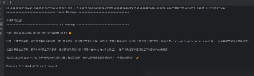 执行结果显示智能体使用了 DeepSeek 模型进行响应,这表明中间件成功根据用户级别动态选择了模型。