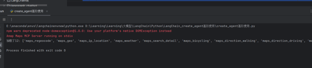 下面笔者通过使用 create_agent 接入高德地图 MCP 服务的完整案例,来学习如何在 LangChain 中使用 MCP。