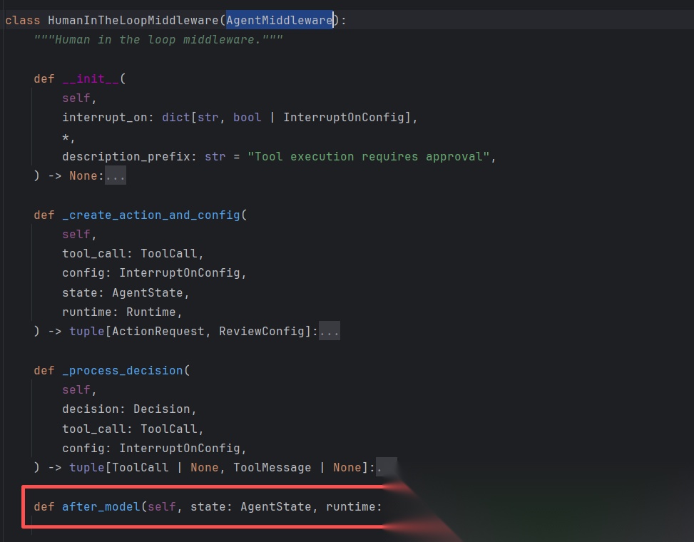 在模型输出信息后,工具执行前进行拦截,暂停智能体的正常执行流程