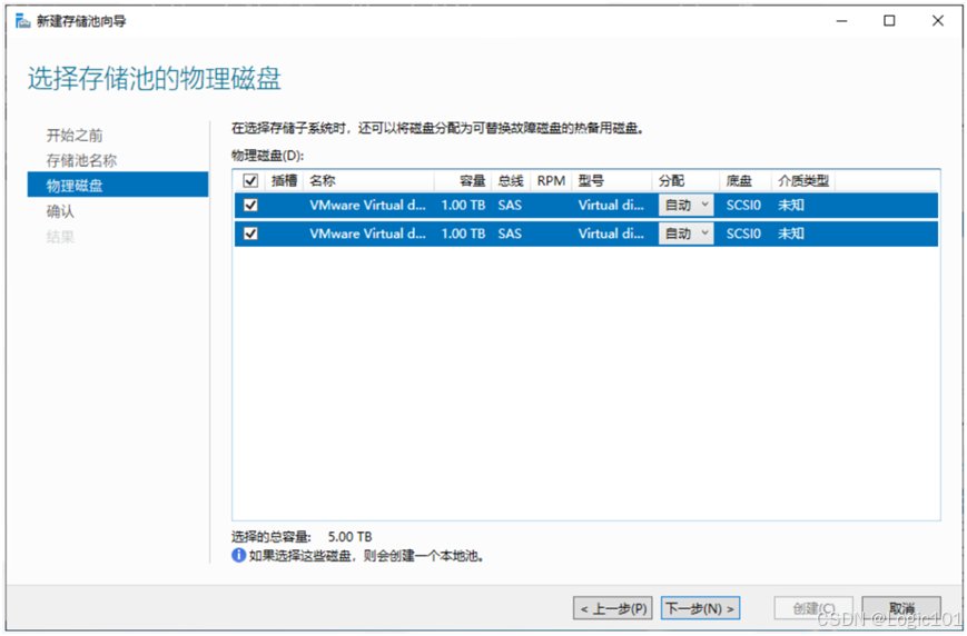 (3)在【物理磁盘】中,选中2块磁盘,点击下一步,如下图所示。