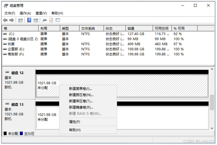 (1)打开磁盘管理,在其中一块虚拟磁盘(磁盘12)上右键选择【新建带区卷】,如下图所示。