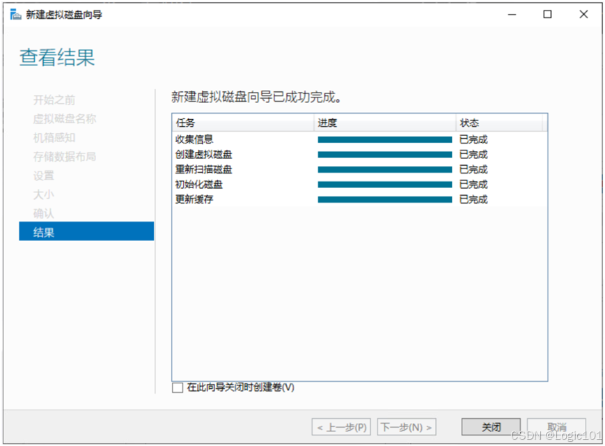 (7)在【结果】界面查看结果,所有进度已完成,取消勾选【在此向导关闭时创建卷】,点击【关闭】,如下图所示。