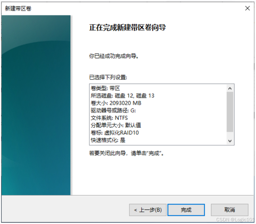 (3)分配驱动器号【G】,在下一步【卷区格式化】中修改卷标为【虚拟化RAID10】,勾选【执行快速格式化】,点击【完成】,如下图所示。