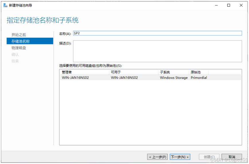 (2)打开新建存储池向导,在【存储池名称】中,输入名称为【SP2】,点击下一步,如下图所示。